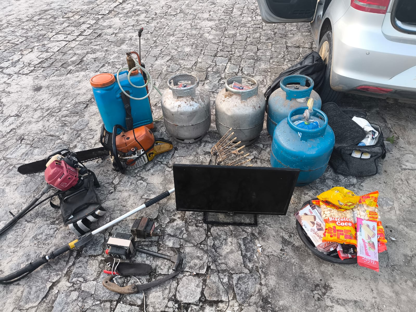 No interior do automóvel foram encontrados diversos itens de valor, incluindo eletrônicos, ferramentas, e objetos pessoais, cuja procedência os ocupantes não souberam explicar.