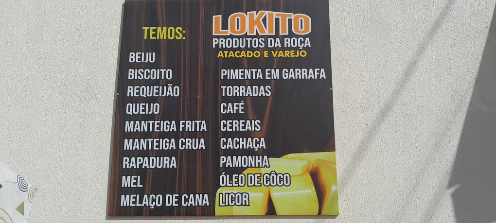 Na Lokito o produto é natural, bom, barato e fácil de adquirir. Tudo que o cliente desejar, vai encontrar na Lokito: Beiju, biscoito, requeijão, queijo, manteiga frita e crua, rapadura, mel, melaço de cana, pimenta em garrafa, torradas, café, cereais, cachaça, pamonha, óleo de coco, licor, iogurte e outras variedades.