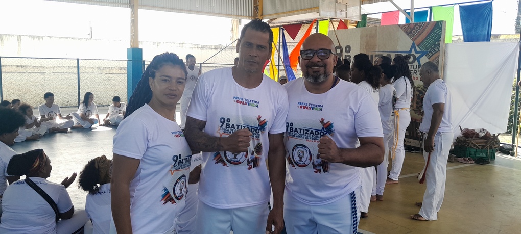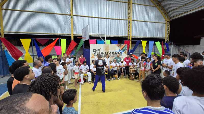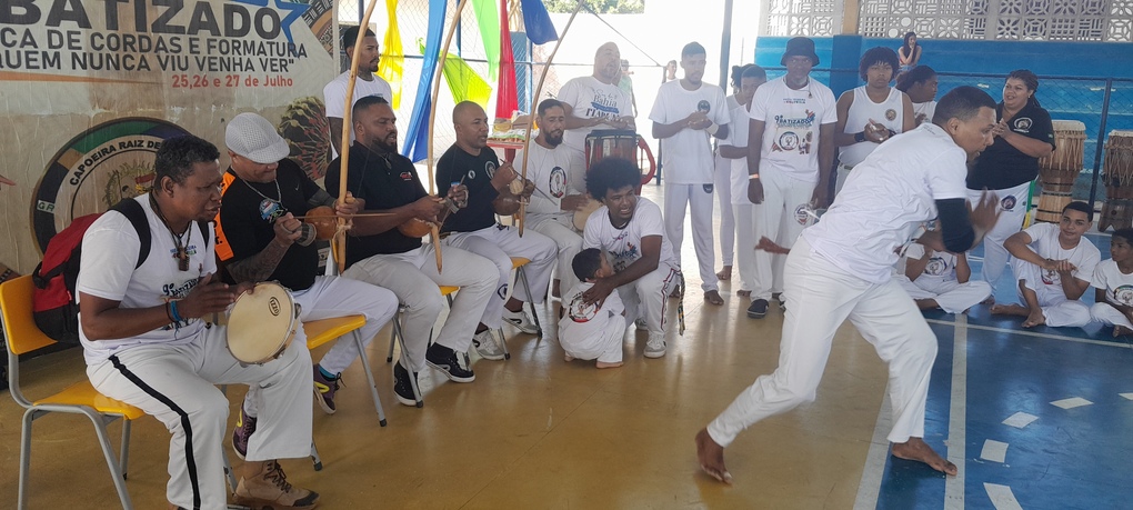 Capoeiristas jogam em círculos, demonstrando seus movimentos, ginga e musicalidade. Crianças, jovens e adultos engrandecem Teixeira de Freitas com presença de diversas regiões. A Escola Pedro Agrizzi foi palco de um final de semana rico sob o comando do grande Mestre Som e sua equipe.