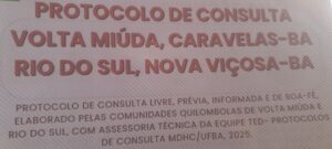 O processo de elaboração contou com a participação ativa das comunidades, a partir de oficinas, sugestões, reformulações e adendos até chegar no documento final. Produzido pelas comunidades Quilombolas de Volta Miúda (Caravelas) e Rio do Sul (Nova Viçosa), assessoria técnica da equipe “TED – Protocolos de Consulta” do MDHC/UFBA, no período de 2024 e 2025, como parte do processo de elaboração do Protocolo de Consulta Livre, Prévia, Informada e de Boa Fé, conforme estabelecido pela convenção 169 da Organização Internacional do Trabalho (OIT), adotada pelo Brasil por meio do Decreto nº 10.088/2019.